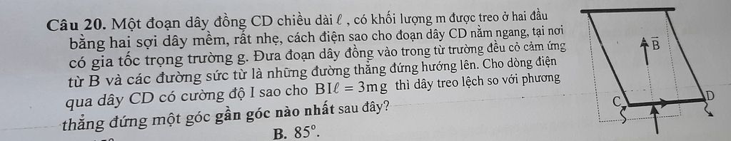 \(\begin{array}{l}\tan \alpha = \dfrac{F}{P} = \dfrac{{BIl}}{{mg}} = 3\\ \Rightarrow \alpha = 71,{56^0}\end{array}\)