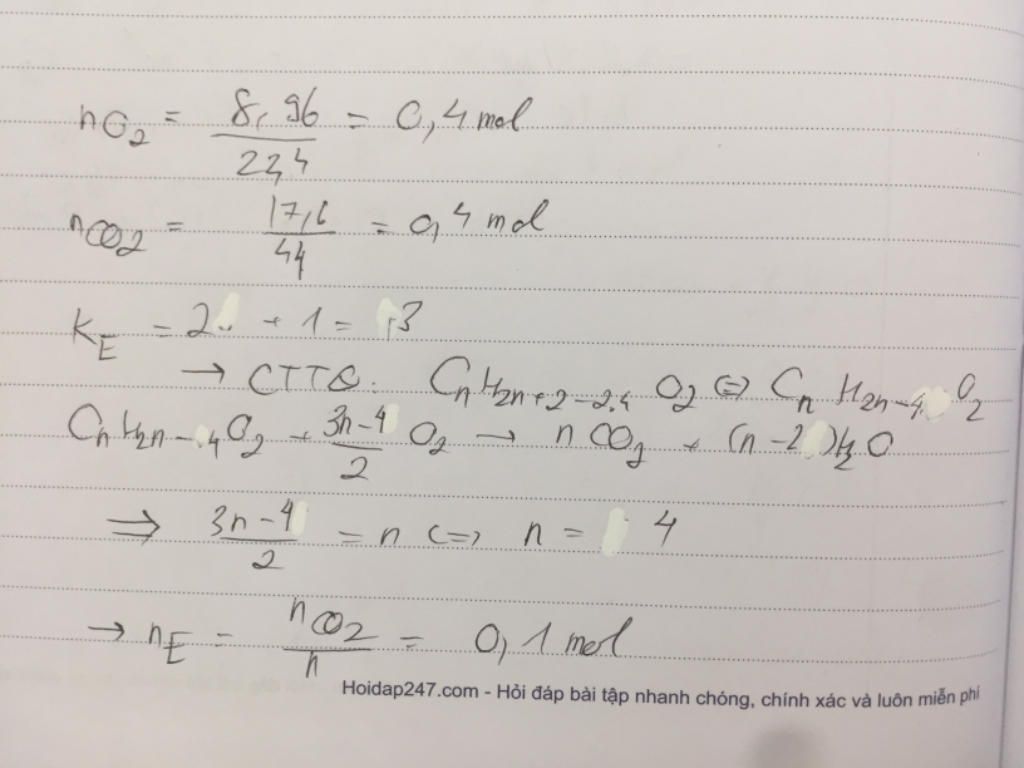 \( \to {n_E} = \frac{{{n_{C{O_2}}}}}{n} = \frac{{0,4}}{4} = 0,1{\text{ mol}}\)
