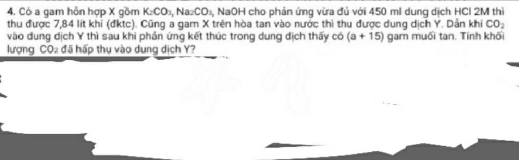4. Có a gam hỗn hợp X gồm K2CO3, Na2CO3., NaOH cho phản ứng vừa đủ với 450 ml dung dịch HCI 2M thì