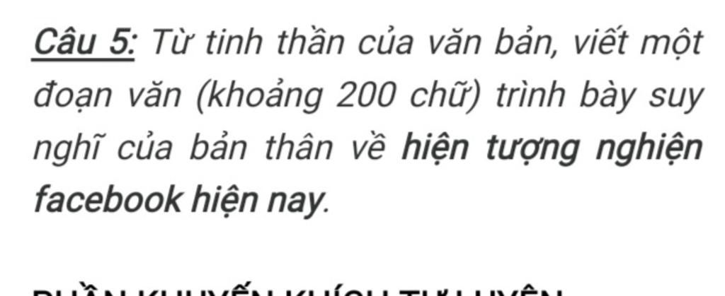 Mạng xã hội đã dần trở thành một phần không thể thiếu của con người trong cuộc sống hiện đại. Thật vậy, việc sử dụng mạng xã hội đã và đang trở nên ngày một phổ biến hơn trong đời sống hàng ngày. Con người sử dụng mạng xã hội như Facebook cho nhiều mục đích khác nhau của bản thân và cách sử dụng mạng xã hội quyết định tác động tích cực hay tiêu cực mà mạng xã hội Facebook đem đến cho con người. Bên cạnh những tác động tích cực mà mạng xã hội như Facebook đem đến cho con người thì một trong những hệ quả tiêu cực mà mạng xã hội đem đến cho con người đó là thực trạng nghiện Facebook. Biểu hiện của việc nghiện sử dụng mạng xã hội đó là không thể sống thiếu được chúng. Dù chúng ta đang làm bất cứ việc gì quan trọng đến đâu thì tâm trí của chúng ta bị choán, bao phủ và kiểm soát bởi những dòng thông báo của Facebook. Con người bị ám ảnh bởi Facebook đến mức không kiểm soát, lúc nào cũng trong tâm trạng muốn kiểm tra thông báo mới từng phút từng giây vì sợ bỏ lỡ thông báo quan trọng. Bất cứ lúc nào có thời gian rảnh là lại sử dụng Facebook như một thói quen không thể kiểm soát của bản thân mình. Thực trạng nghiện Facebook cũng ngày càng phổ biến ở Việt Nam hơn, nhất là thế hệ trẻ. Chúng ta vẫn hay bắt gặp những bạn trẻ có thể sử dụng hàng giờ đồng hồ của bản thân để lướt một cách vô vị những trang mạng xã hội, nhưng khi đọc sách thì luôn biện cớ không có thời gian. Tác hại của việc nghiện Facebook đó chính là ngốn hết thời gian dành cho việc học, những việc có ích cho bản thân. Nghiện mạng xã hội cũng làm cho mối quan hệ giữa con người với nhau dần trở nên lạnh nhạt, xa cách. Đó là còn chưa kể đến những nội dung xấu và độc hại mà mạng xã hội Facebook có thể đem đến cho con người. Để có thể sử dụng mạng xã hội an toàn và lành mạnh, chúng ta cần học cách sử dụng mạng xã hội văn minh, đúng mực và nhất là không nên lạm dụng quá mức. Tóm lại, thực trạng nghiện mạng xã hội cần được đẩy lùi dần dần trong cuộc sống hàng ngày của con người.