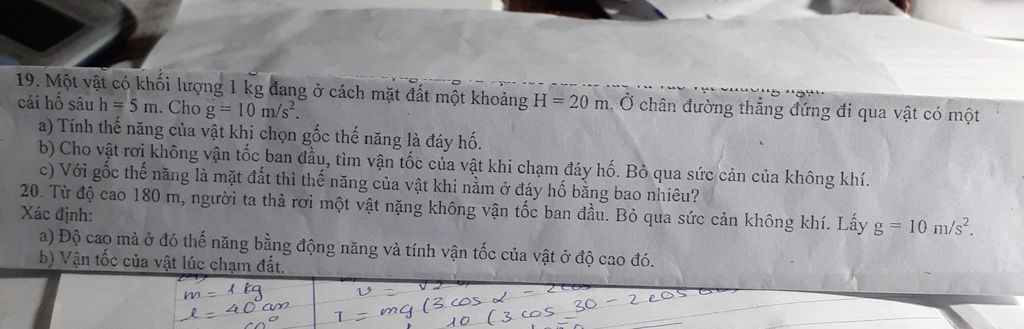 19.a. Thế năng ban đầu của vật nếu chọn gốc thế năng ở đáy hó là: