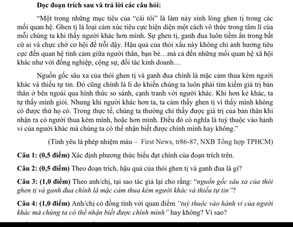 Câu 3. Tác giả cho rằng như vậy vì: khi thua người khác, ta cảm thấy ghen tị vì ta không có được những gì họ có. Khi ta thiếu tự tin, ta sẽ kiếm tìm giá trị bản thân bằng việc so sánh và cạnh tranh với người khác. Từ đó, sự ghen tị, ganh đua trỗi dậy.