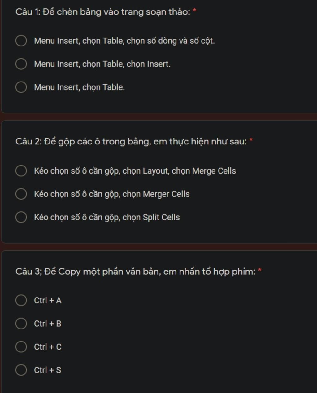 Câu 1. A. Menu Insert , chọn Table, chọn số dòng số cột