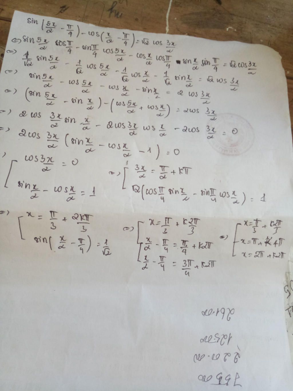 Ở dòng thứ 6 sai rồi Sin x chứ không phải sin x/2 CT thức là sin (a-b/2) thì chỉ còn sin x thôi