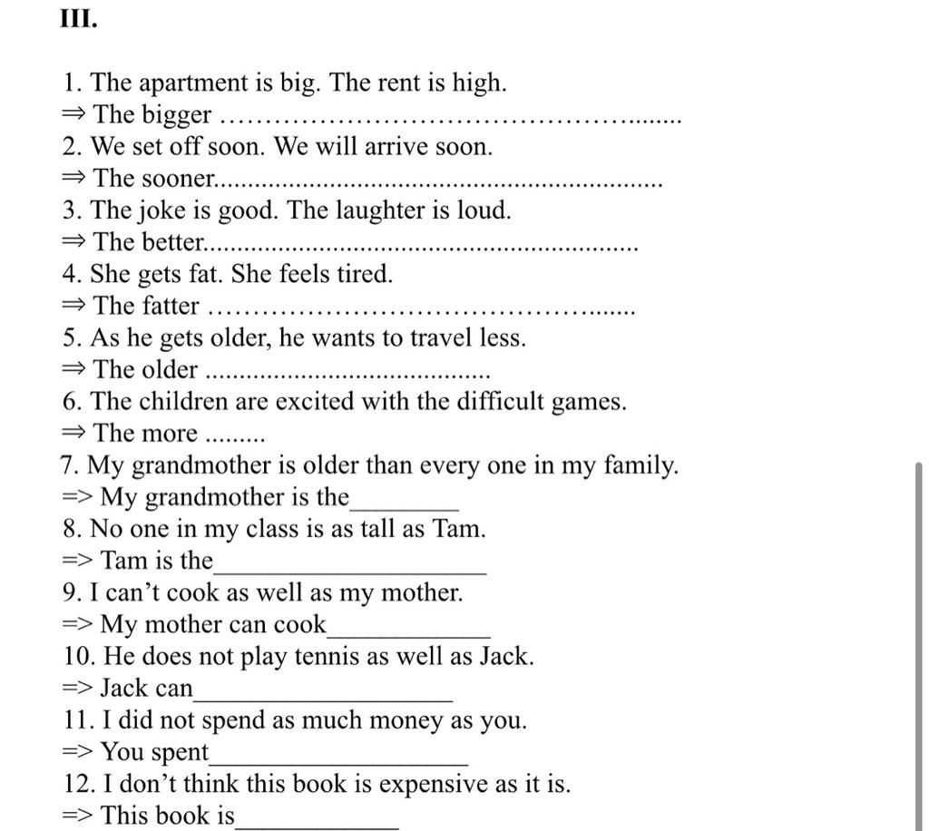 Giải thích : câu 1 - câu 6 dùng lí thuyết câu càng càng The + Comparative + S1 + V1, the + Comparative + S2 + V2