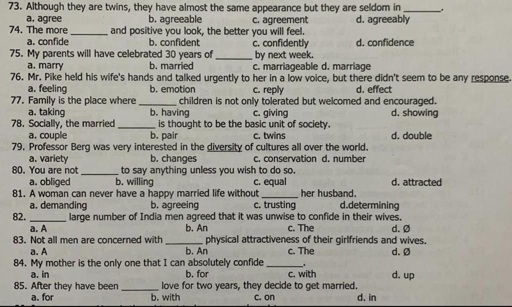 75D ( cần 1 danh từ đứng sau giới từ “of” để bổ nghĩa cho giới từ. Marry (v): cưới; Married (a): đã kết hôn; Marriageable (a): có thể kết hôn; Marriage (n): lễ kết hôn)
