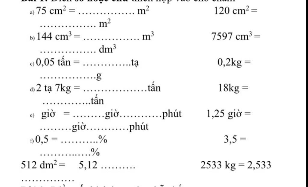 `text{c) 0,05 tấn = 0,5 tạ}`