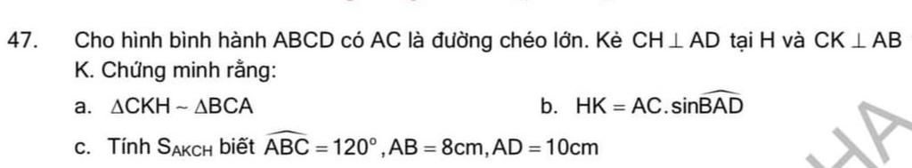 c) Tính diện tích tứ giác AKCH nếu góc BAD = 60 độ, AB=4cm, AD=5cm