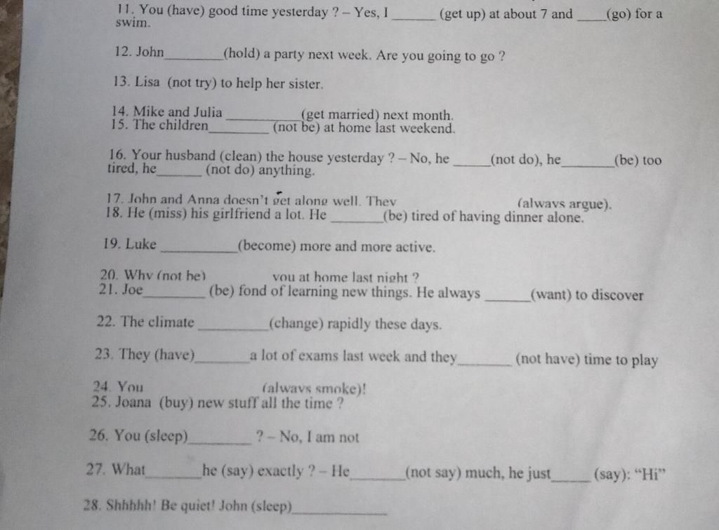 $11.$ Did you have, got up, went (yesterday-> quá khứ đơn)