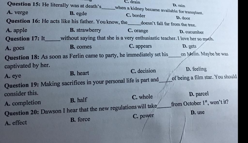 15. D [be at death's door: hấp hối, gần chết (vì bệnh nặng)]