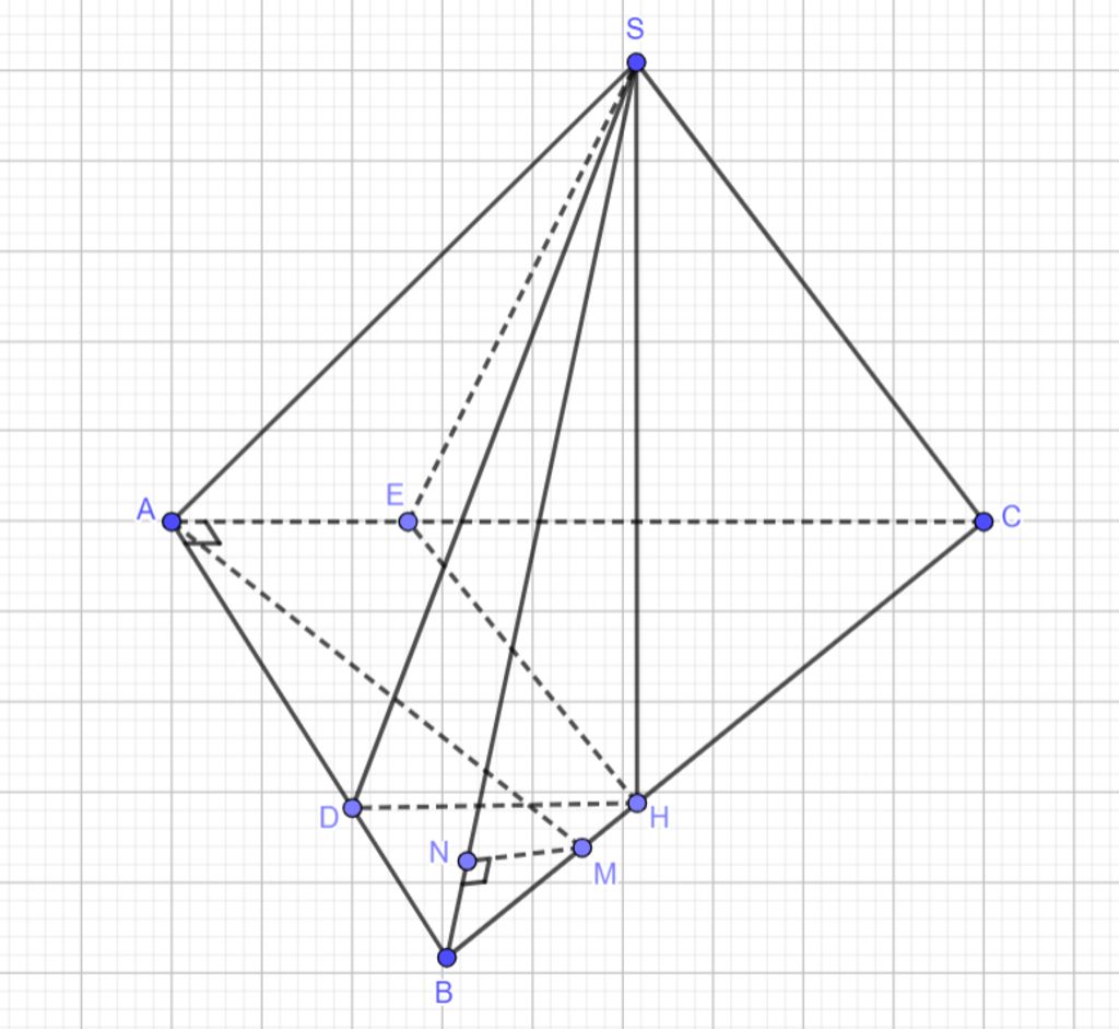 Tương tự vẽ $HE\bot AC$ tại $E$, $AC\bot SH\Rightarrow AC\bot(SHE)\Rightarrow AC\bot SE$