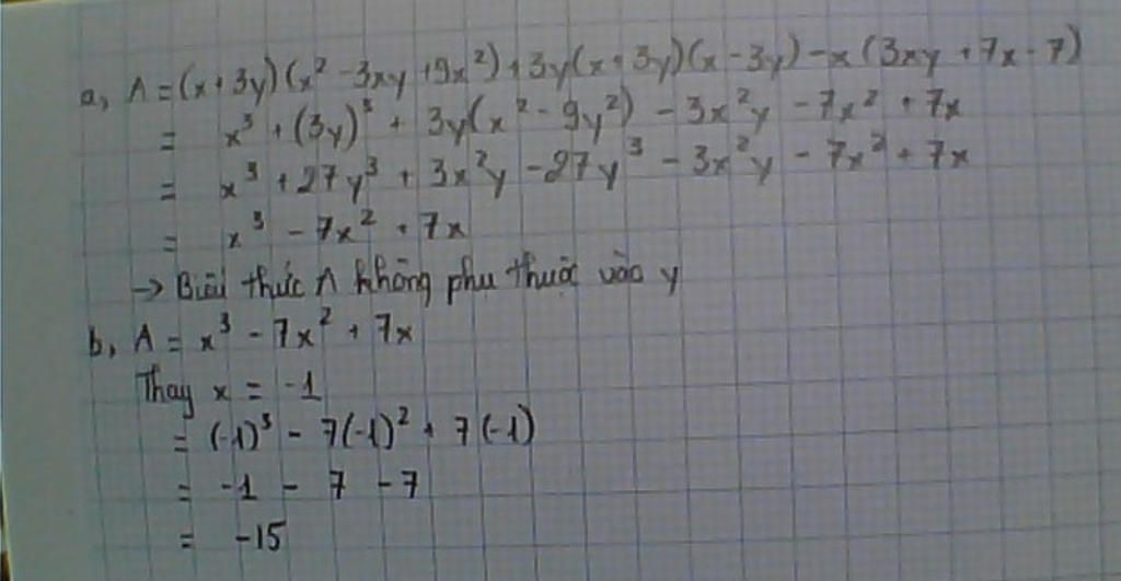 `A=(x+3y)(x^2-3xy+9y^2)+3y(x+3y)(x-3y)-x(3xy+7x-7)`