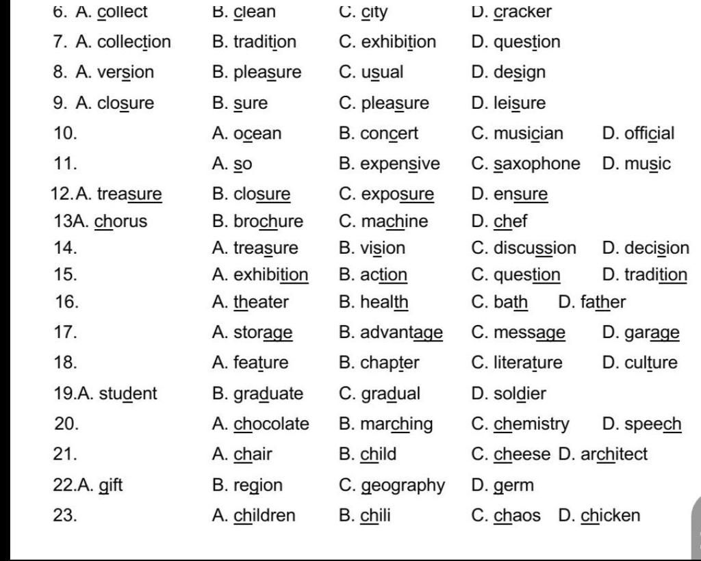 17. D (âm ɑːdʒ, còn lại là âm ich)