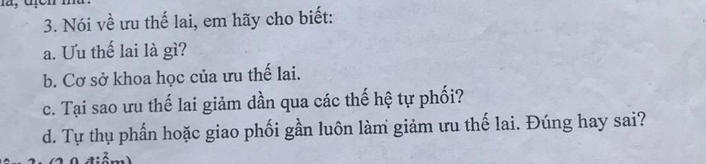 c. Ưu thế lai giảm qua thế thệ tự phối vì quần thể tự phối làm giảm tỉ lệ kiểu gen dị hợp tăng tỉ lệ kiểu gen đồng hợp , các alen lặn quy định tính trạng xấu có cơ hội được biểu hiện