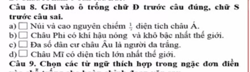 `text{d)}` Châu Mĩ có diện tích lớn nhất thế giới là sai . Châu lục có diện tích lớn nhất thế giới là Châu Á.