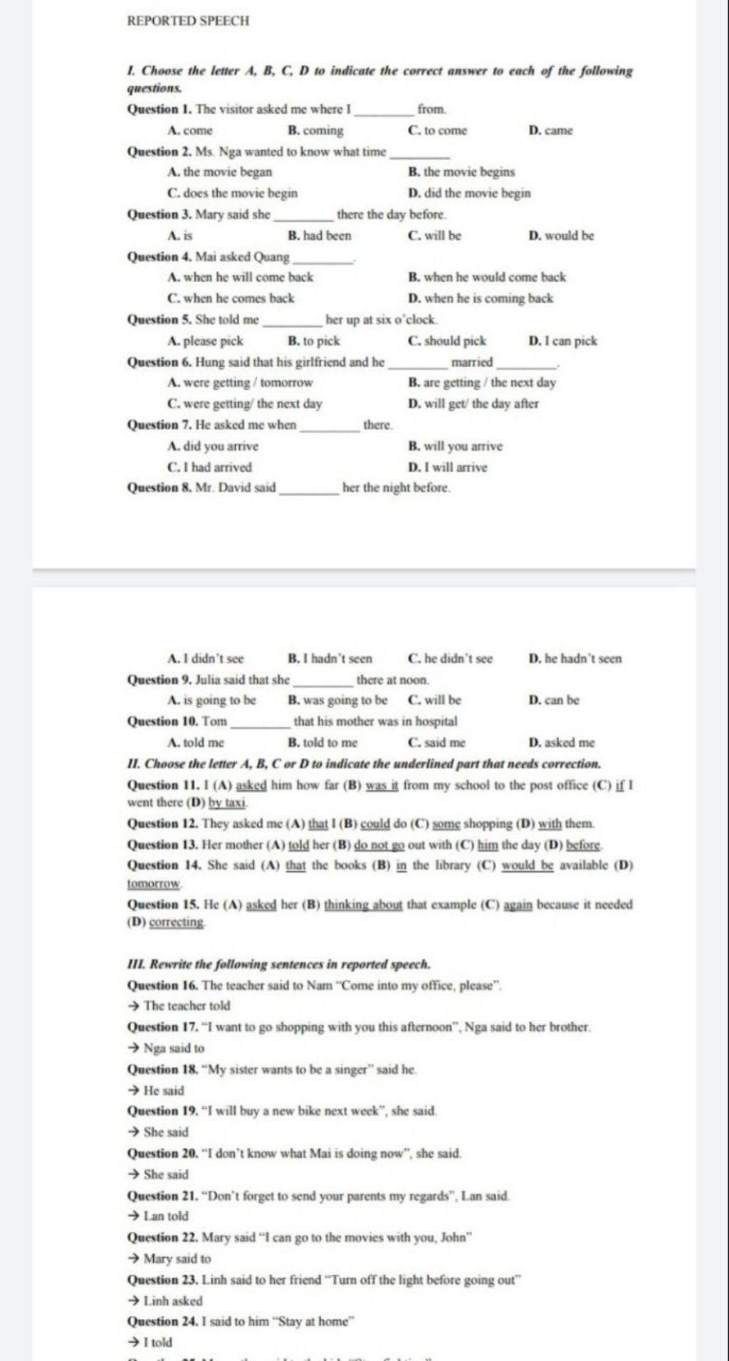 Dù sao thì những câu trả lời tiếp theo là: 25. My mother told the kids to stop fighting. 26. The teacher asked me not to make noise in the class. 27. His mother said that he could speak English well. 28. The child asked the beggar if he was very poor. 29. He said to Lan that he would visit Ha Long Bay. 30. The police asked where they had stayed the previous night. Rút gọnDù sao thì những câu trả lời tiếp theo là: 25. My mother told the kids to stop fighting. 26. The teacher asked me not to make noise in the class. 27. His mother said that he could speak English well. 28. The child asked the beggar if he was very po... xem thêm