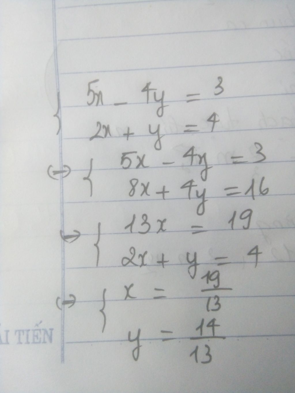 ⇔ $\left \{ {{x=\frac{19}{13}} \atop {5.\frac{19}{13}-4y=3}} \right.$