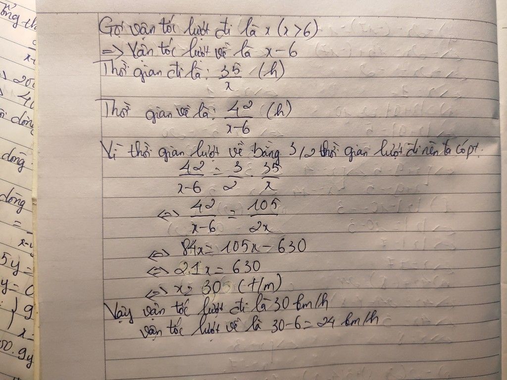Vì thơi gian lượt về bằng `3/2` thời gian lượt đi nên ta có pt:
