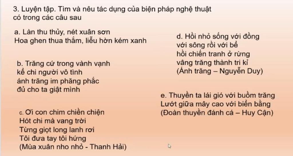 e, Ẩn dụ "lái gió, buồm trăng" →Thể hiện thiên nhiên tiếp sức cho con người. Con người trong tư thế làm chủ thiên nhiên, làm chủ biển trời quê hương.