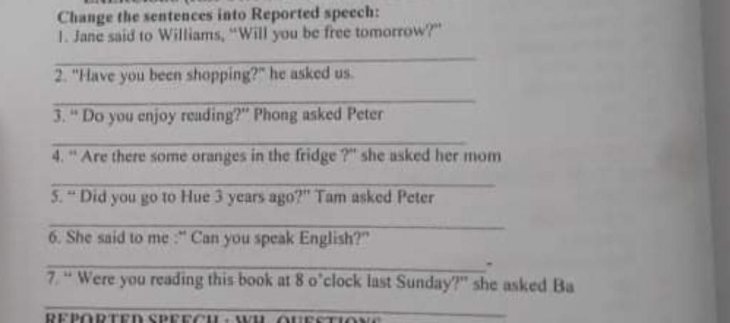 6, She asked me if I could speak English. 7, She asked Ba if he had been reading that book at 8 o'clock the previous day.