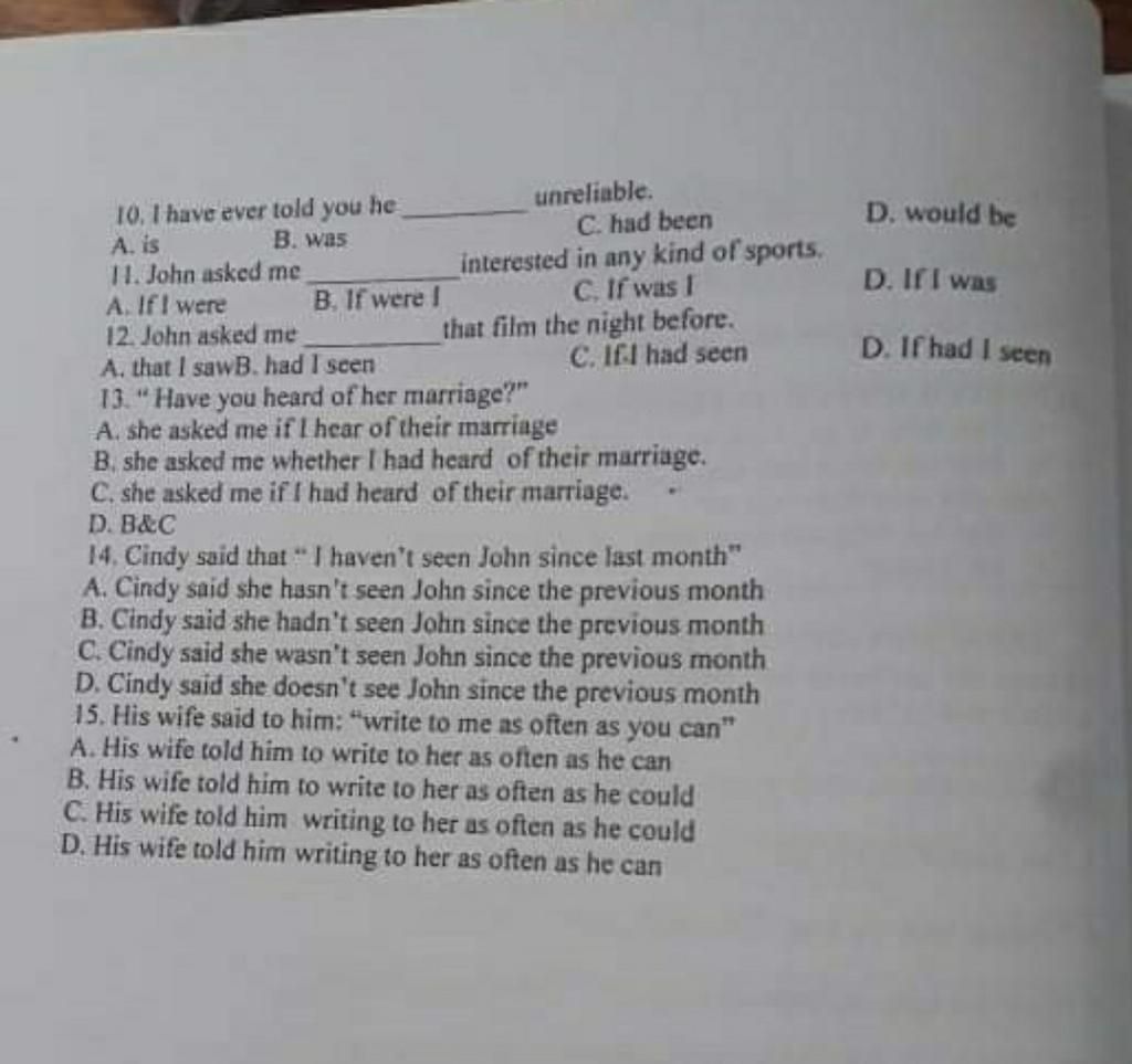 12. John asked me If I had seen that film the night before.