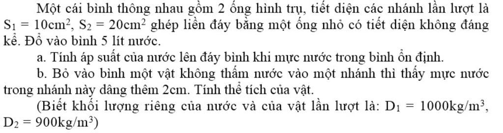 b) Thể tích của vật chìm trong nước bằng tổng thể tích mực nước dâng lên trong hai nhánh.