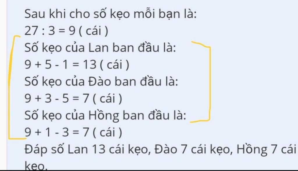 Tính số kẹo của Lan bạn đầu : Ta lấy số kẹo khi chia cho mỗi bạn là 9 + số kẹo bạn Lan cho bạn Đào rồi trừ đi số kẹo bạn Hồng cho lại bạn Lan .