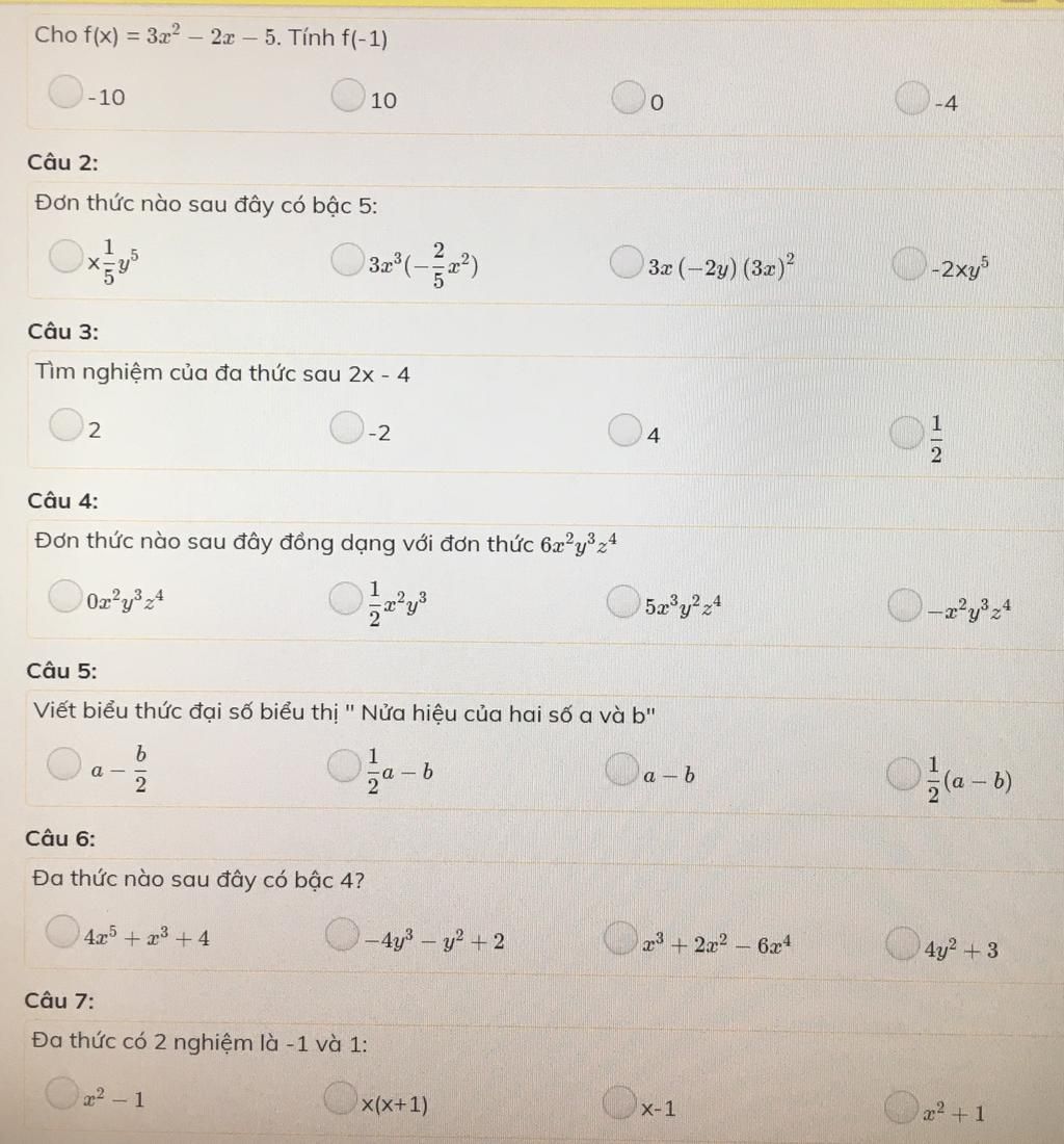Câu 4: Để đa thức đồng dạng thì chỉ có thể là $A$ hoặc $D$ mà $0x^2y^2z^4=0$ nên chọn $D$