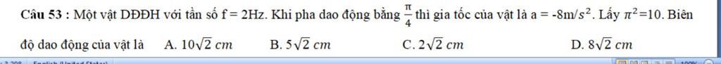 \Rightarrow - 800 = - {\left( {4\pi } \right)^2}.A.\cos \frac{\pi }{4}\\