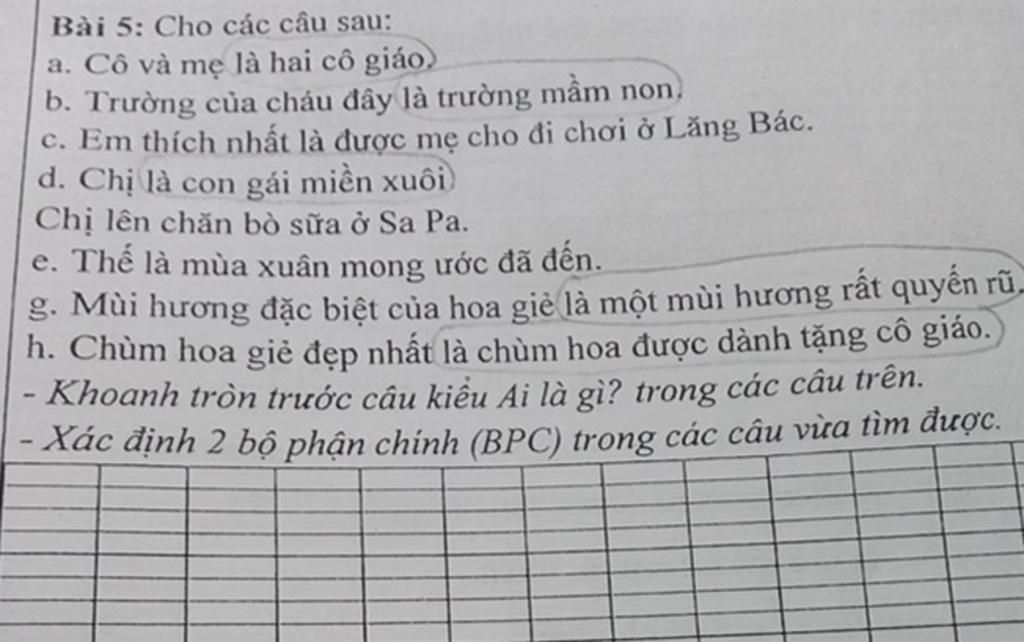 Bạn ơi bài 5 chỉ khoanh a b c d chứ không phải khoanh vào vị ngữ đâu nha vì đầu bài nói là khoanh tròn trước kiểu câu Ai là gì?