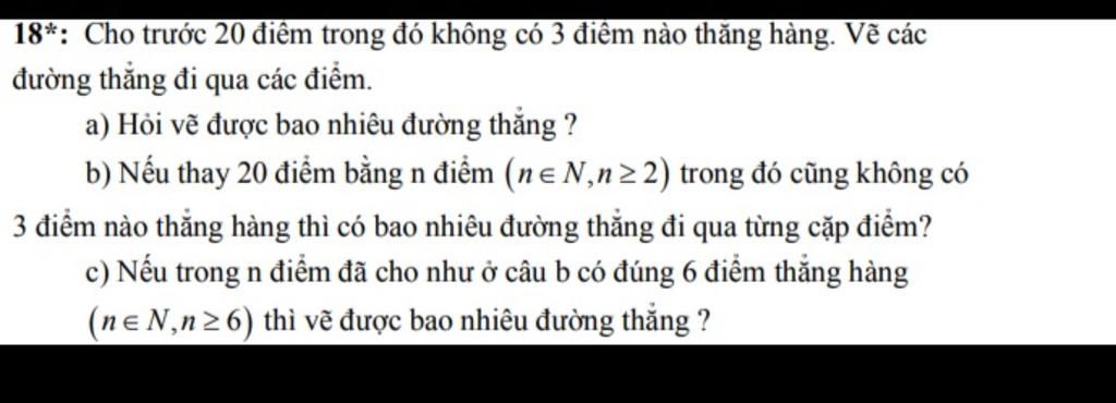 Giả sử trong `n` điểm ko có bộ `3` điểm nào thẳng hàng .Theo câu `b)` ta vẽ được `(n(n-1))/2` đường thẳng.Vì trong `n` điểm đã cho có `6` điểm thẳng hàng nên số đường thẳng giảm đi là :`(6.5)/2-1=14` (đường thẳng)