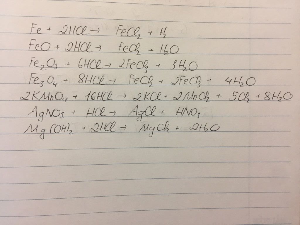 Fe, FeO, Fe2O3, Fe3O4, KMnO4, AgNO3, Mg(OH)2 tác dụng với HCl