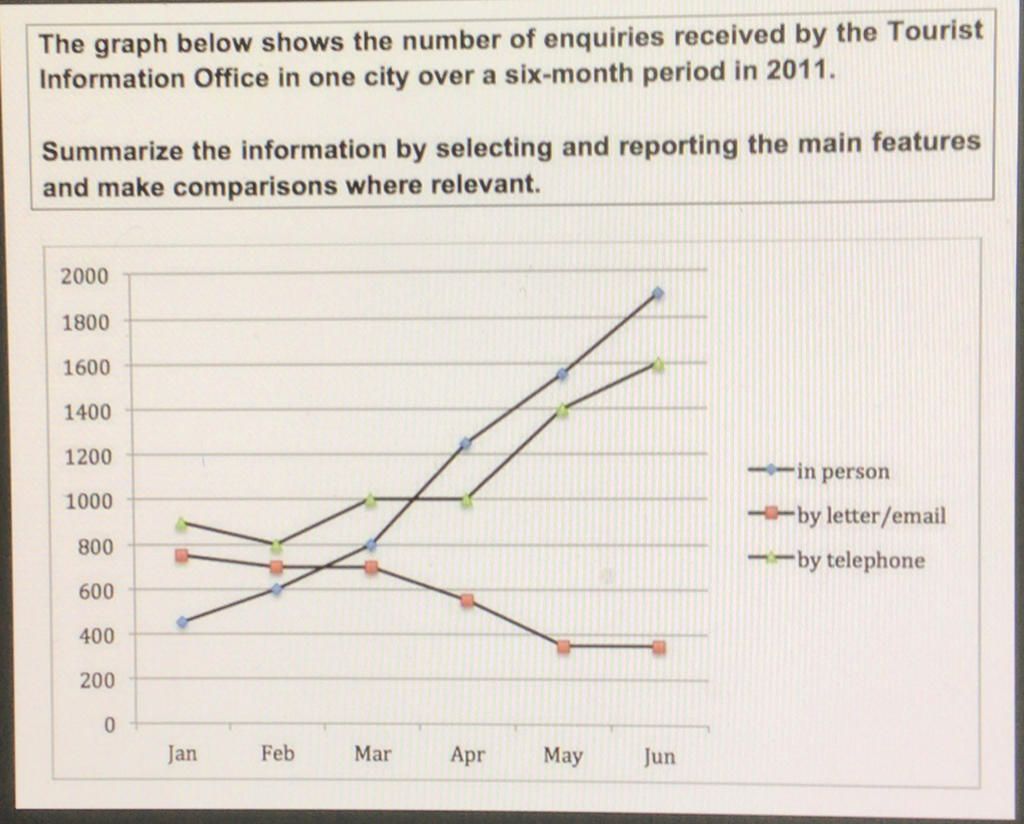 The line graph demonstrates the amount in terms of analysis that gave to the Tourist Information Office during the first half of 2011. Overall, contacting through telephone and face to face are the most common ways and also surged strongly since April. On the contrary, letters/emails were less popular when they witnessed a decline from the first month of 2011. In the first two months, both using telephone and writing methods dip at least 200 hundred customers, however, at that moment contacting in person climbed from the number of approximately 400 to 600. From the second month of that year to June, writing letters and emails kept plummeting worse by each month. Contrastly, using the telephone started to have a huge leap rather than the previous months. Likewise, contacting face to face have a consistent flow up to June.