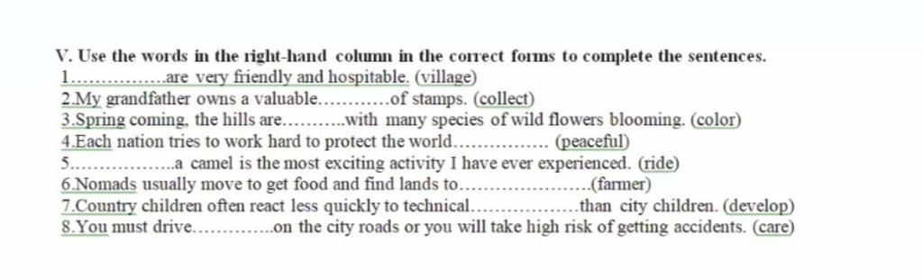 Tóm tắt lại là: 1 villagers, 2 collection, 3 colorful, 4 peace, 5 riding, 6 farm, 7 development, 8 carefully.