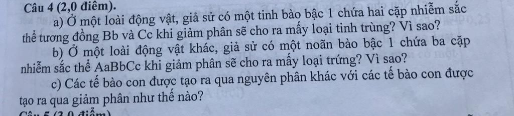 - Một tinh bào bậc I chứa hai cặp NST tương đồng Bb và Cc khi giảm phân bình thường sẽ cho ra hai loại tinh trùng là BC và bc hoặc Bc và bC vì một tinh bào bậc I giảm phân bình thường chỉ tạo ra tối đa hai loại tinh trùng