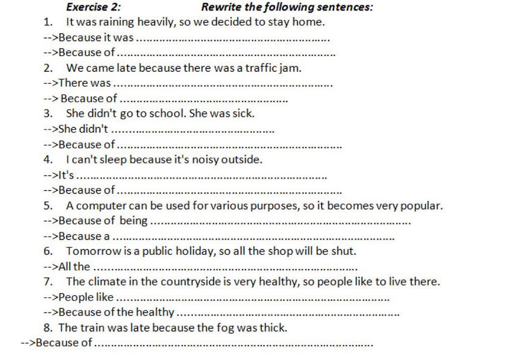 1. Because + Clause, Clause = Because of + N/V_ing, Clause: bởi vì