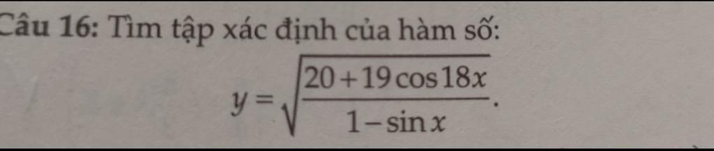 \(y=\sqrt{\dfrac{20+19\cos18x}{1-\sin x}}\\ĐKXĐ:\begin{cases}\dfrac{20+19\cos18x}{1-\sin x}\ge 0\\\sin x\ne 1\end{cases}\quad(1)\\\text{Ta có:}\\+)-1\le\cos18x\le1\\\Leftrightarrow -19\le19\cos18x\le19\\\Leftrightarrow 1\le20+19\cos18x\le39\\\Leftrightarrow 20+19\cos18x>0\quad\forall x.\\+)\sin x\le 1\\\Leftrightarrow 1-\sin x\ge 0\quad\forall x.\\\Rightarrow \dfrac{20+19\cos18x}{1-\sin x}>0\quad\forall x\quad nên\\(1)\Leftrightarrow \sin x\ne 1\\\Leftrightarrow x\ne\dfrac{\pi}{2}+k2\pi.(k\in\mathbb{Z})\\TXĐ:D=\mathbb{R}\backslash\left\{\dfrac{\pi}{2}+k2\pi\Big|k\in\mathbb{Z}\right\}.\)