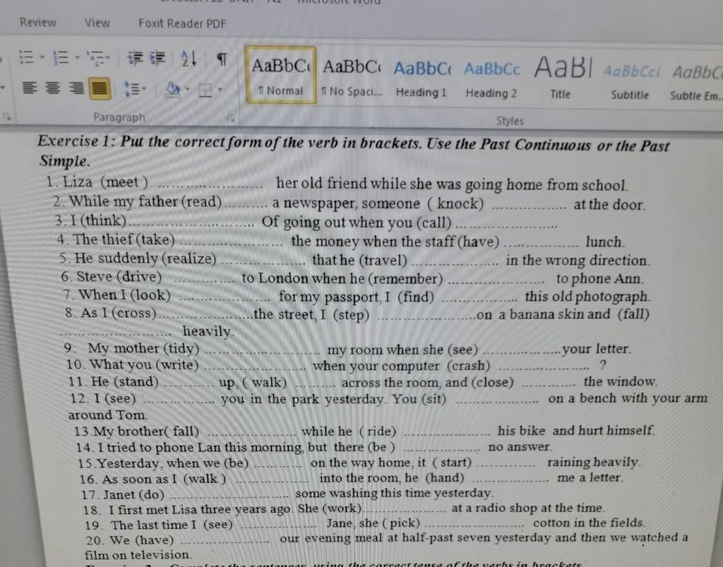Exercise 1: Put the correct form of the verb in brackets. Use the Past Continuous or the Past