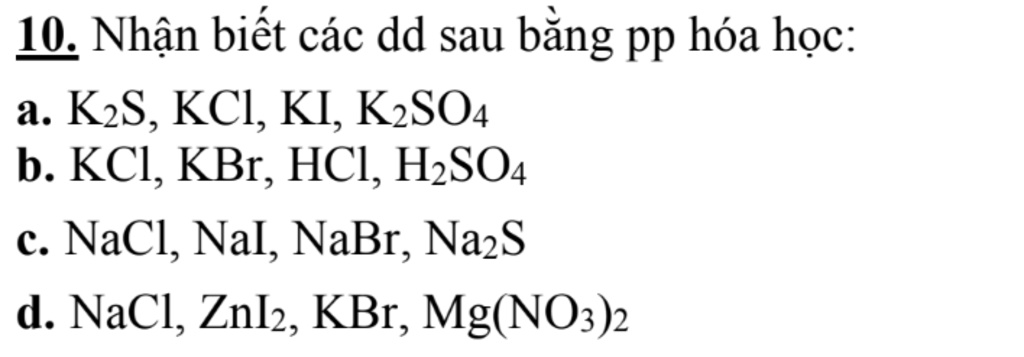 Thả quỳ tím vào 4 chất. KCl, KBr ko đổi màu. HCl, H2SO4 hoá đỏ. Nhỏ AgNO3 vào 2 chất ko đổi màu. KCl kết tủa trắng, KBr kết tủa vàng. Nhỏ BaCl2 vào 2 chất hoá đỏ. H2SO4 có kết tủa, HCl thì ko.