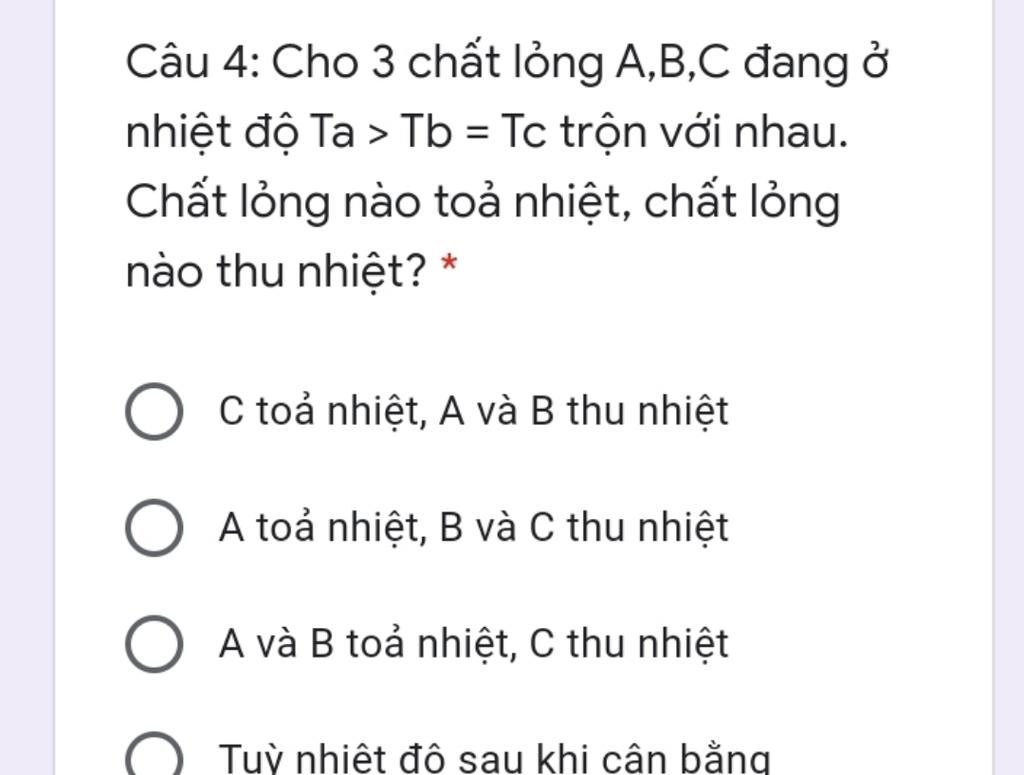 Vì bình A có nhiệt độ lớn hơn nhiệt độ bình B và nhiệt độ Bình C, mà nhiệt độ bình B bằng nhiệt độ bình C nên vật A sẽ tỏa nhiệt, vật B và C sẽ thu nhiệt.