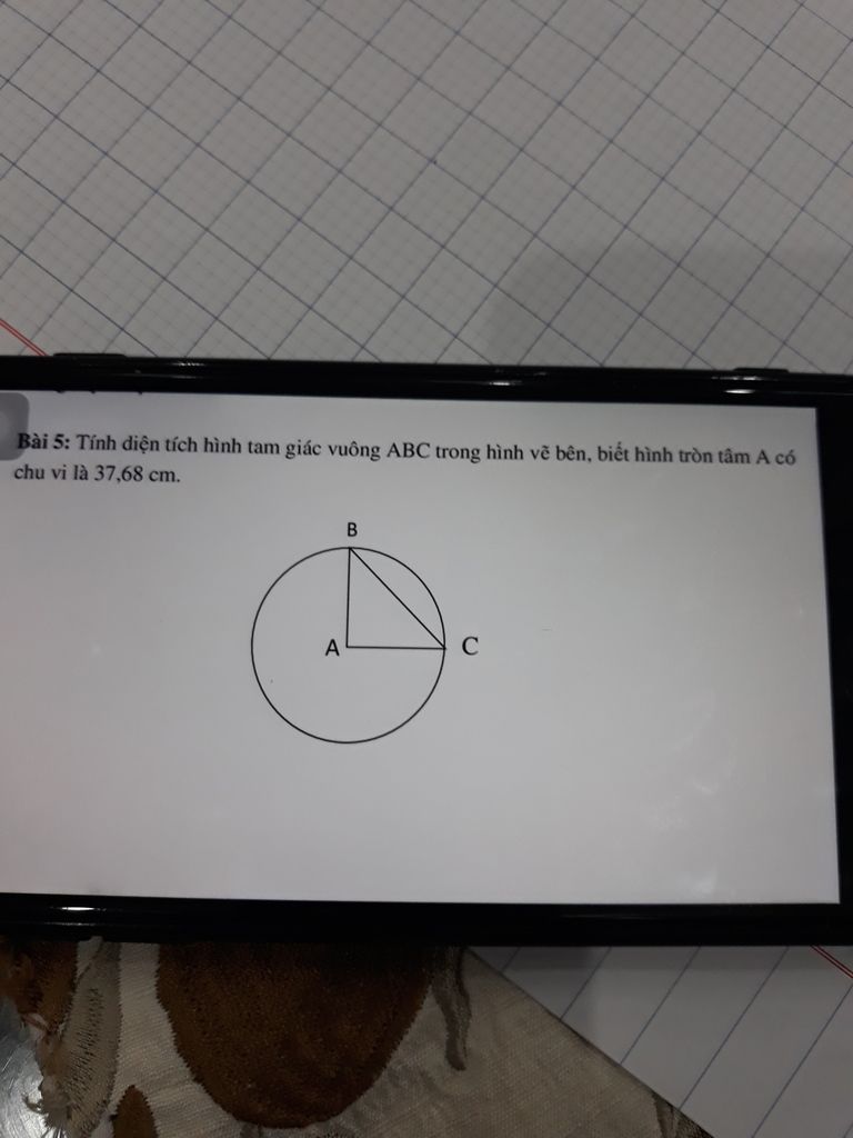 Giải: Bán kính hình tròn tâm Á là: 37,68 : 3,14 : 2= 6( cm) S∆ABC = 6×6:2= 18(cm2) Đáp số:18 cm2