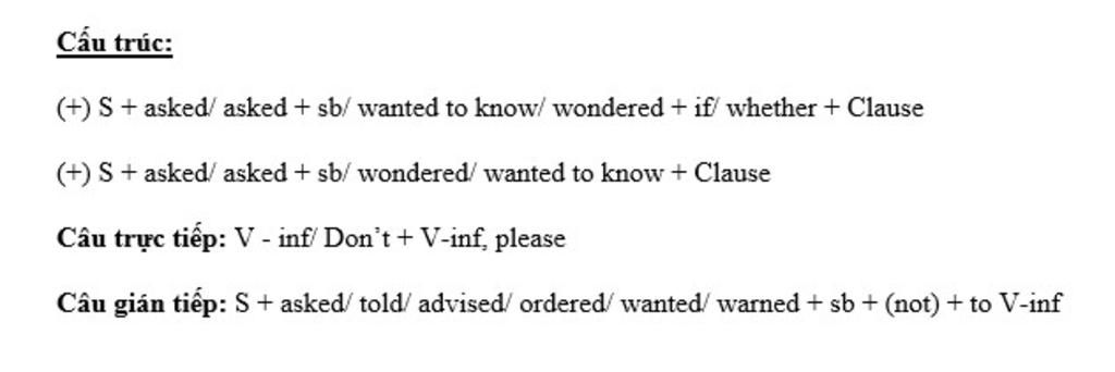 - S + asked (+ O)/ wanted to know/ wondered + Wh-words + S + V.