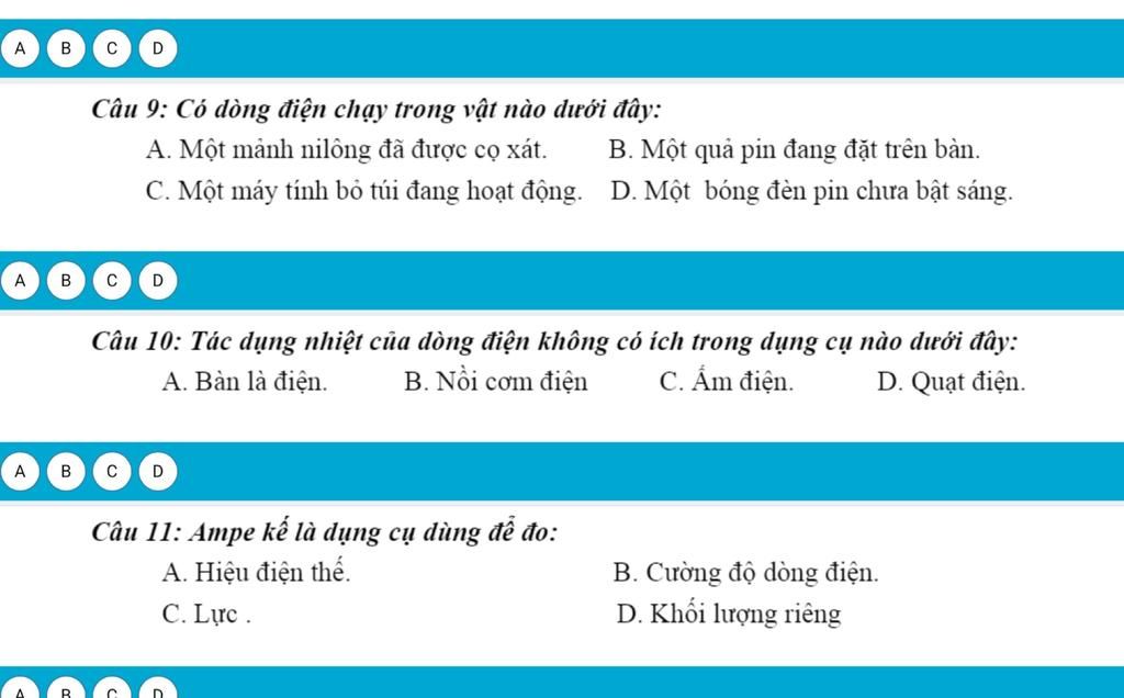 Câu 10: Tác dụng nhiệt là làm nóng vật dẫn mà nó chạy qua như: làm bàn là nóng, làm bóng đèn sáng,... Trong 4 bốn đáp án trên thì quạt điện không có tác dụng làm nóng, có tác dụng làm mát cơ thể, ...