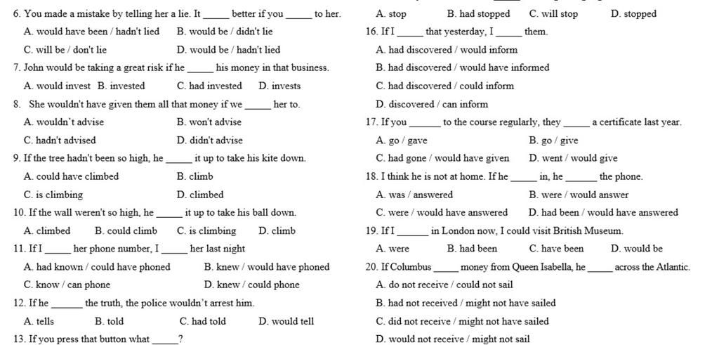 ok bn câu 6 là câu điều kiện loại 3 câu 7 là câu điều kiện loại 2 câu 8 là câu điều kiện loại 3 câu 9 là câu điều kiện loại 3 câu 10 là câu điều kiện loại 2 câu 11 là câu điều kiện loại 3 câu 12 là câu điều kiện loại 2 câu 16 là câu điều kiện loại 3 câu 17 là câu điều kiện loại 3 câu 18 là câu điều kiện loại 2 câu 19 là câu điều kiện loại 2 câu 20 là câu điều kiện loại 3 cấu trúc câu đk loại 2: If + Past simple, Would/Could/Should (not) + V (inf) cấu trúc câu đk loại 3: If + Past perfect, Would/Could/Should (not) + have + V3/ed Chúc bạn học tốt Rút gọnok bn câu 6 là câu điều kiện loại 3 câu 7 là câu điều kiện loại 2 câu 8 là câu điều kiện loại 3 câu 9 là câu điều kiện loại 3 câu 10 là câu điều kiện loại 2 câu 11 là câu điều kiện loại 3 câu 12 là câu điều kiện loại 2 câu 16 là câu điều kiện l... xem thêm