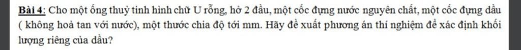 lấy nước cho vào ống thủy tinh rồi đo khối lượng riêng,SAU đó cho dầu vào vì dầu ko tan trong nc nên chỉ cần lấy KLR của tổng thể trừ cho KLR của nc sẽ ra dầu