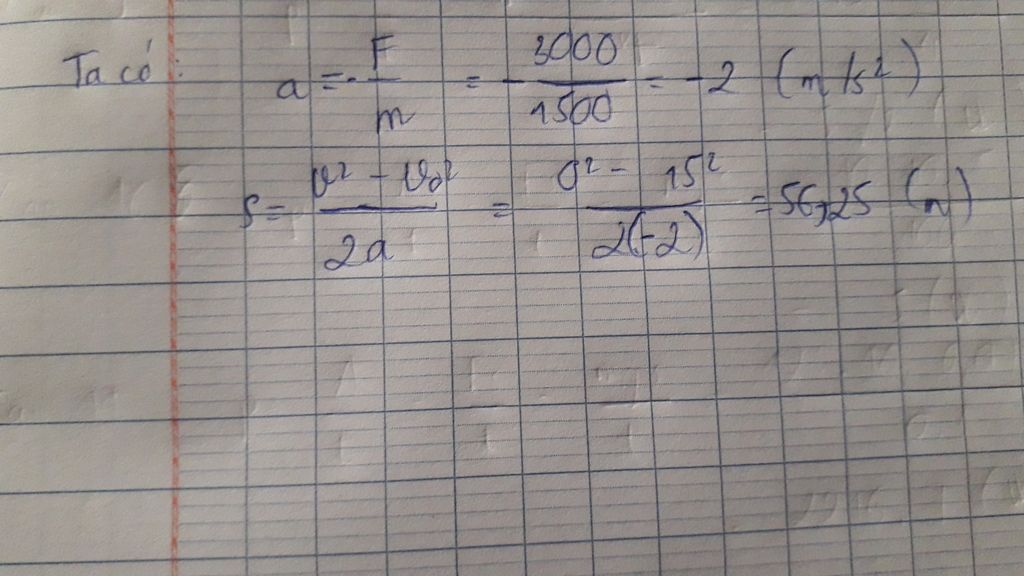 a = \frac{F}{m} = \frac{{ - 3000}}{{1500}} = - 2\left( {m/{s^2}} \right)\\