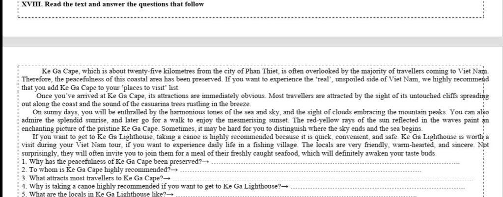 Giải thích: Most travellers are attracted the sight of its untouched cliffs spreading out along the coast and the sound of the casuarina trees rustling in the breeze.
