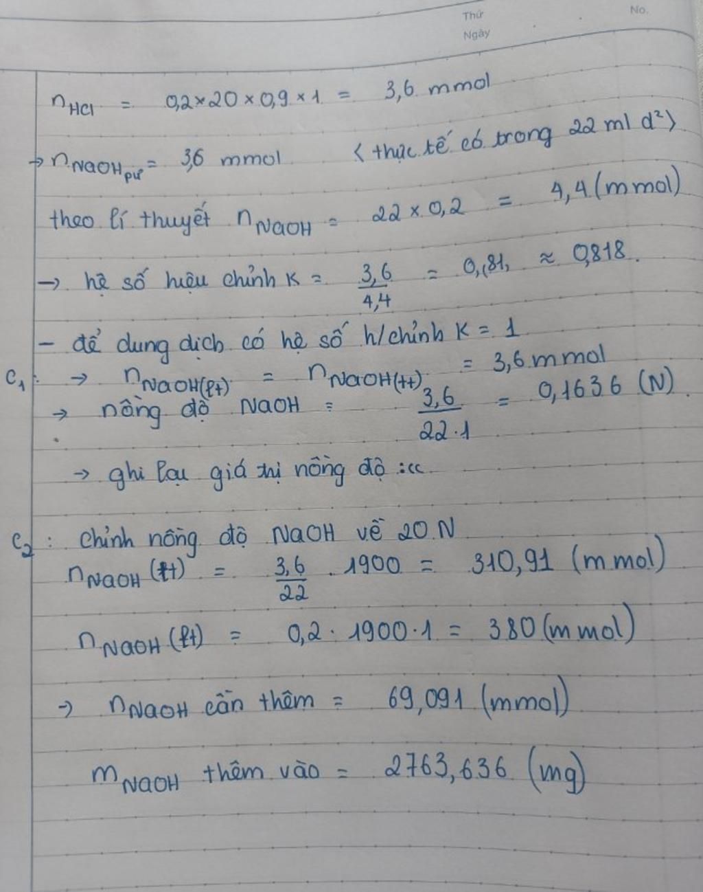 Pha 2000 ml dung dịch NaOH xấp xỉ 0,2 N . Xác định độ chuẩn bằng 20 ml dung dịch axit HCl 0,2 N có K = 0,900 hết 22 ml dung dịch NaOH vừa pha.