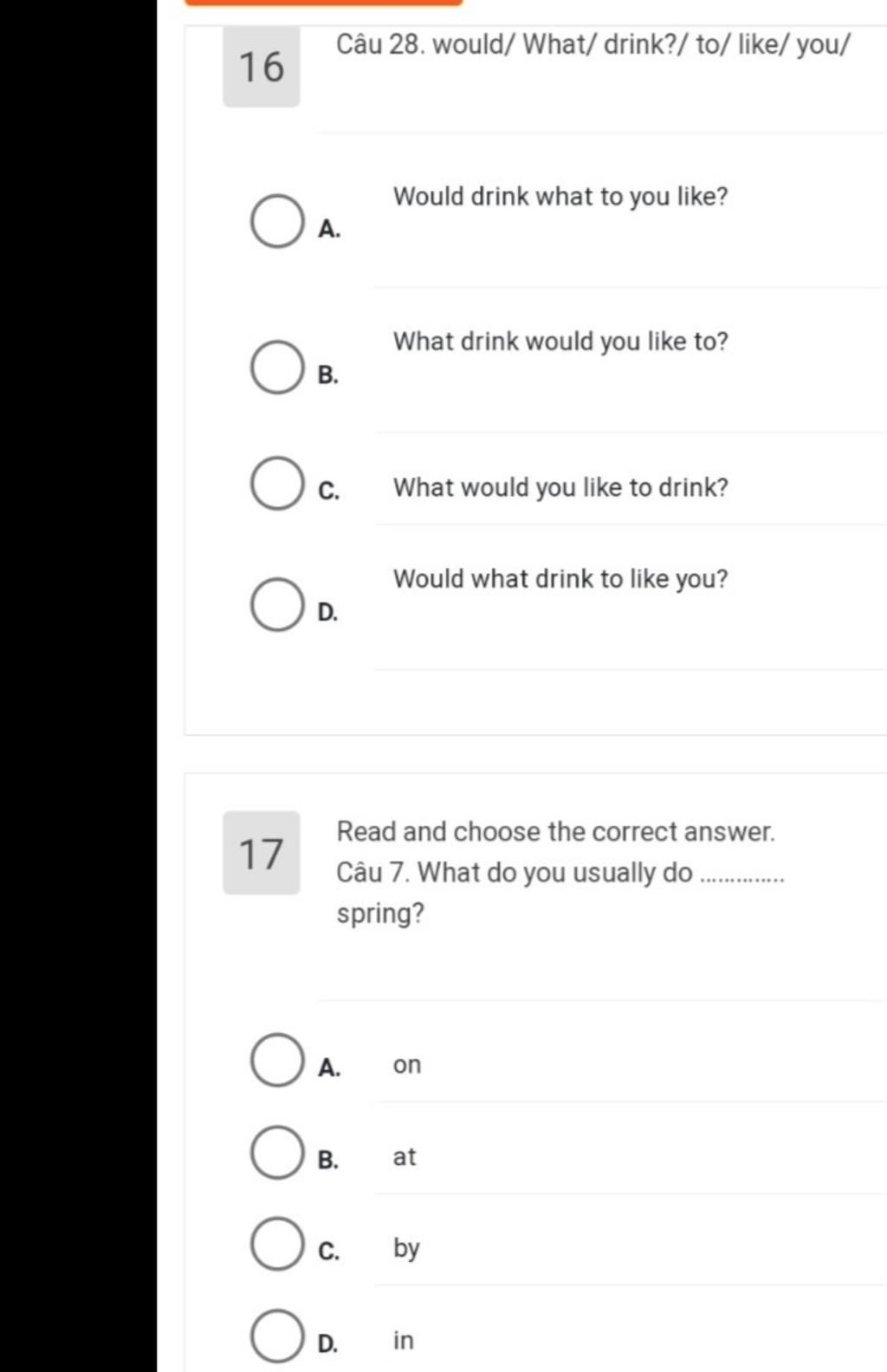 Câu 28: C (Câu đó dịch là bạn có muốn uống gì không. Câu hỏi: What + would + S + like + to V?)