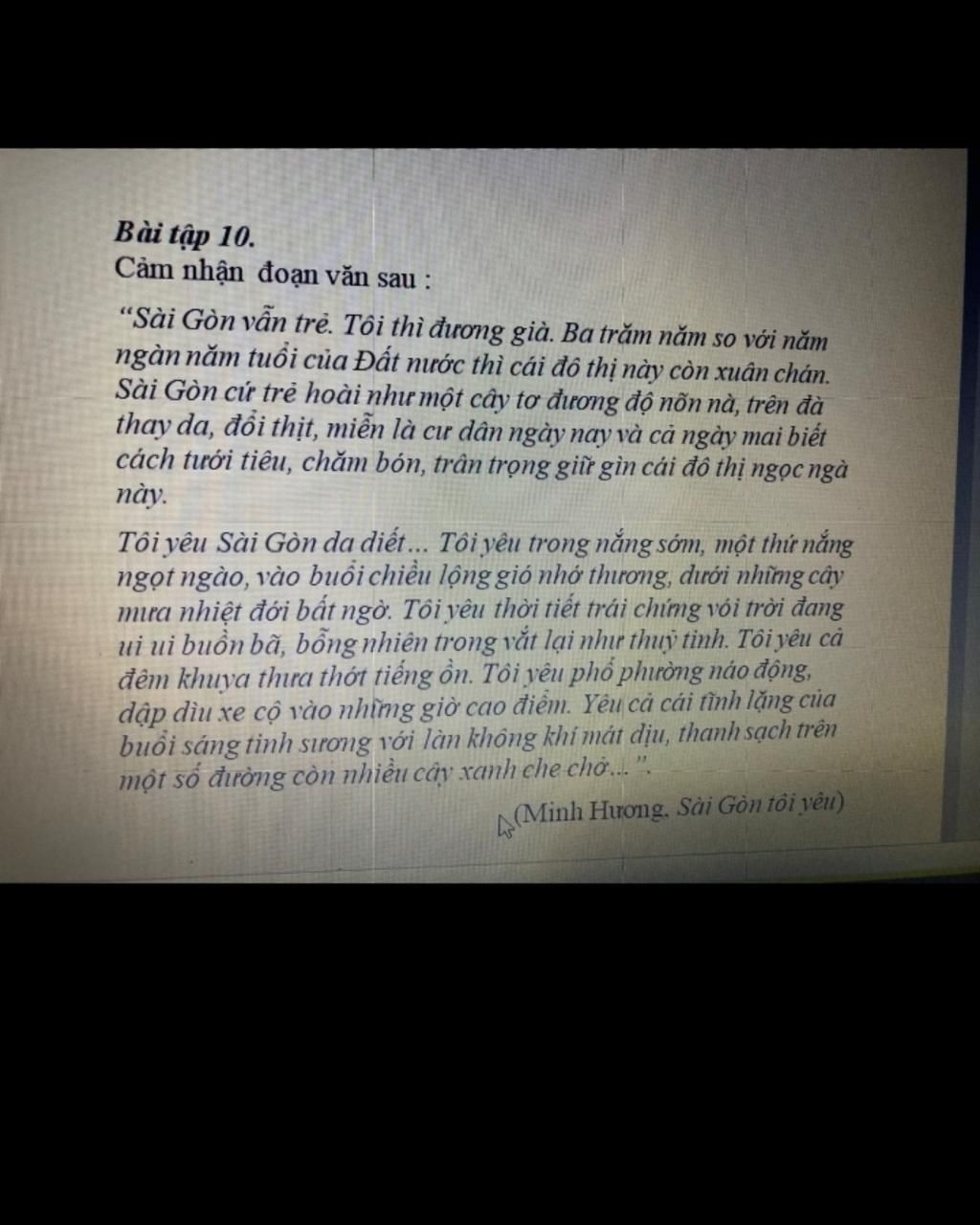 Qua đoạn văn của Minh Hương, trong tác phẩm Sài Gòn Tôi Yêu ta thấy được cái vẻ đẹp tươi trẻ bừng đầy sức sống của Sài Gòn. Minh Hương đã sử dụng thành công biện pháp tương phản làm nổi bật lên cái vẻ đẹp ấy của Sài Gòn, rằng Sài Gòn thì vẫn rất trẻ, còn bản thân thì đã đương già. Tác giả cũng rất khéo léo khi so sánh sự tươi trẻ của Sài Gòn với cây tơ đương độ nõn nà, làm cho hình ảnh Sài Gòn hiện lên tươi trẻ, khỏe khắn, và tràn đầy cái năng lượng của một cái cây trước mắt bạn đọc. Qua đó, mà tác giả còn khéo léo nhắc nhở rằng cư dân phải chăm bón, tưới tiêu cho Sài Gòn như đang ẩn dụ cho hình ảnh chăm bón, tưới tiêu một cái cây tơ vậy. Cách ẩn dụ này rất thông minh, ẩn dụ việc chăm sóc một cái cây tơ đương vừa so sánh để muốn nói hãy bảo vệ và chăm sóc cho Sài Gòn. Nhìn chung trong bài thơ, ta thấy được cái tình yêu da diết mà Minh Hương dành cho Sài Gòn. Để rồi từ đó ta nhận ra rằng Sài Gòn đẹp biết bao, một Sài Gòn trong nắng sớm, một thứ nắng mà Minh Hương cảm thấy ngọt ngào, và Sài Gòn vào những buổi chiều lộng gió nhớ thương, dưới những cây mưa nhiệt đới bất ngờ. Đó toàn là những hình ảnh thật quen thuộc của Sài Gòn mà ít ai trong chúng ta cảm nhận được, vậy mà qua đoạn văn , bằng những từ ngữ phong phú và cách viết tinh tế của Minh Hương, ta thấy cái ánh nắng trong Sài Gòn sao mà đẹp đến thế, cái cơn mưa làm sao mà lại thơ mộng, thương nhớ như vậy. Và tác giả đã cảm nhận được hình ảnh sau cơn mưa của Sài Gòn, tác giả yêu cái thời tiết trái chứng đang vi vi buồn bã bỗng dưng lại trong vắt như thủy tinh, khiến ta thêm yêu làm sao cái cảnh trời Sài Gòn đang đổ mưa ào ào , bỗng dưng lại trong vắt, chắc hẳn khung cảnh lúc đó sẽ rất đẹp biết mấy nếu ta biết cách thường thức như Minh Hương. Rồi tác giả còn yêu cả đêm khuya tiếng ồn , yêu cả phố phường náo động, yêu cả cái tĩnh lặng của buổi sáng tinh sương. Từ bài Sài Gòn Tôi Yêu mà ta đã thấy được những hình ảnh dễ dàng bắt gặp khi ở hay đến Sài GÒN, những hình ảnh mà hẳn ai ai trong chúng ta cũng thấy hằng ngày tại Sài Gòn, nhưng mà ít ai lại có thể nhận ra cái vẻ đẹp ẩn chứa bên trong. Và từ đoạn văn trên, mà tôi thêm yêu Sài Gòn, thêm quý Sài Gòn, quý cả những buổi trời nắng, khi trời mưa, quý những phút tĩnh lặng và cả tối náo động trong cái thành phố này. Đọc đoạn văn, ta nhớ làm sao hình ảnh Sài Gòn bình yên đến thế, đẹp đẽ đến thế những ngày chưa có dịch. Xin hãy trả Sài Gòn lại với cái vẻ đẹp vốn thuộc về nó, xin hãy trả lại sự náo động nơi phố phường của Sài Gòn mà giờ đây con đường lại vắng tênh không còn một ai. Cuối cùng, đoạn văn trên "" SÀI GÒN TÔI YÊU", còn có ý nhắc nhở bạn rằng hãy bảo vệ, hãy cùng nhau chung tay bảo vệ và xây dựng SÀI GÒN, Thành phố xinh đẹp của Đất nước ta. Tôi yêu Sài Gòn, yêu Sài Gòn rất nhiều